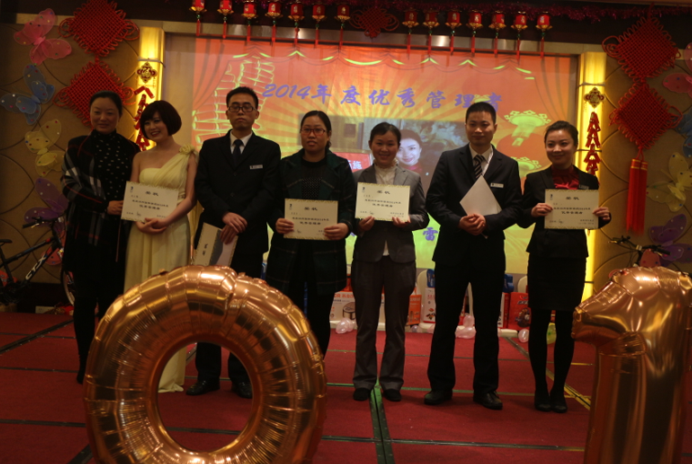 在一首润邦版本的《最炫民族风》喜气洋洋的歌声中,以“迎新辞旧,逆风飞‘羊’”为主题的联欢会正式拉开序幕,首先对酒店2014年 “年度优秀员工”“年度优秀管理员”及“年度优秀部门”进行了表彰。酒店总经理黄飚先生对这一年为润邦辛苦奉献的员工及家人表示感谢,员工代表也为黄总送上的祝福。其后,各部门的节目表演加上“萝卜蹲”、“猜成语”等游戏以及“抽奖环节”将联欢会推向高潮,欢声笑语一浪高过一浪。节目中,由5名优秀员工组成的评审团对各部门节目表演进行了评分,最终工程部的《笛子独奏》获得一等奖、餐饮部《茶艺表演》获得二等奖、前厅销售部带来的改编版《白雪公主》则获得三等奖,最后在全体演员及管理人员的合唱《我们是一家人》的歌声中完满落幕。