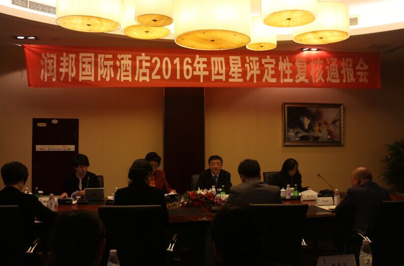 2016年11月1日-2日,市星评专家武国强先生、刘祖建女士、赵彩虹女士、蒲琳女士一行四人对润邦国际酒店进行了四星评定性复核对标检查。 11月1日下午15:00召开本次评定性复核首次会,会议由武国强先生主持,由润邦国际酒店总经理黄飚先生就酒店近三年来的工作情况及成效向星评专家进行简要汇报。会后,在酒店黄总经理、叶琴琴总助的陪同下,星评专家一行四人对酒店的客房、餐厅、厨房、前厅及后勤区域进行了实地检查。 11月2日上午9:30召开了酒店四星评定性复核通报会,会上,各星评专家对酒店良好的的员工精神面貌、专业的维护与保养技术、精细化的服务、良好稳健的经营状况及规范化的管理等几大亮点给予了好评,并对存在的不足提出了宝贵意见和建议。同时,本次检查专家小组组长武国强先生对润邦国际酒店在历经八年的成长后,始终坚持标准,并在实践过程中真实体现对标价值,给予了肯定。武国强先生代表星评组宣布:润邦国际酒店符合四星级酒店的标准,检查组一致同意通过四星级标准的审核,并如实上报检查情况,由上级主管部门进行最后审批。 最后,润邦国际酒店总经理黄飚先生表示:润邦国际酒店将继续坚持标准、维护标准、执行标准,认真落实检查小组提出的意见,对标整改。