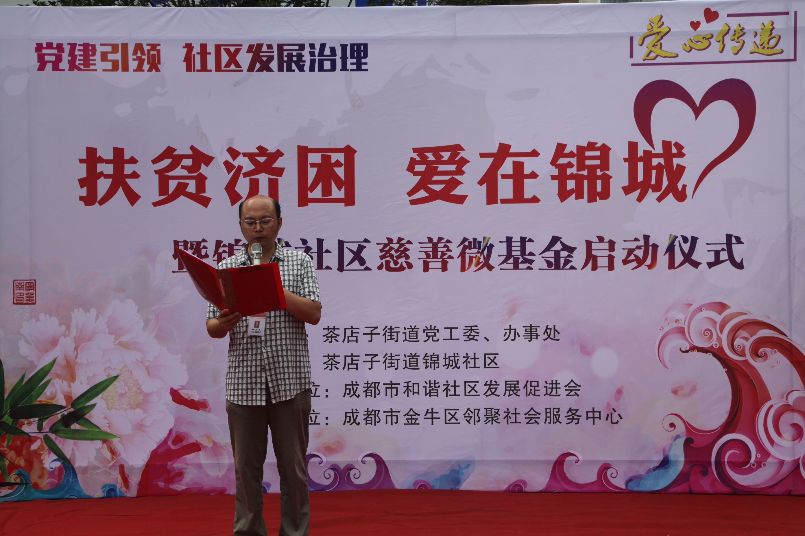 2019年7月25日上午9:30,由成都市金牛区茶店子街道党工委、办事处主办,成都市金牛区茶店子街道锦城社区承办、成都市和谐社区发展促进会指导、成都市金牛区邻聚社工服务中心协办的2019年第一届“扶贫济困.爱在锦城”文艺汇演暨社区慈善微基金启动仪式活动在在社区老邻居广场举行,锦城社区党委书记付萍,党委副书记、居委会主任徐进。党委副书记林艳曦、居委会副主任郑文建、茶店子街道副主任聂斌、派出所代表及21家爱心企业、100余名居民参与此次启动仪式。 首先,由星梦启程社会服务中心的老师带领我们用手语《感恩的心》拉开今天活动的序幕。成都市和谐社区发展促进会副部长黄子玲为锦城社区慈善微基金总干事付萍授牌正式成立成都市慈善总会社区专项慈善基金锦城社区慈善微基金。 茶店子街道副主任聂斌致辞,代表锦城社区的全体人员对参与的领导及嘉宾和工作人员致以最真挚的感谢,并宣布启动仪式开始。同时锦城社区主任徐进为大家宣读“锦城社区慈善微基金”招募倡议书,表明建立“社区慈善微基金”的目的是在社区传递爱心,弘扬慈善文化,挖掘社区在地资源,培养社区自组织,支持社区公益项目开展,提升社区居民参与,促进社区公共服务的发展和社区共融共建共享。“社区微基金”的建立将会为社区发展、改善社区公共设施、志愿服务等方面起到重要的推动作用,同时也是政府政策性救助的有效补充。